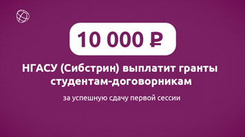 НГАСУ (Сибстрин) выплатит гранты студентам-договорникам за успешную сдачу первой сессии Решением Ученого совета НГАСУ (Сибстрин) для обучающихся договорной формы обучения в 2020/2021 учебном году предусмотрена грантовая поддержка в размере 10 тысяч рублей при условии сдачи первой сессии на «хорошо» и «отлично» в установленные календарным учебным графиком сроки. Грант могут получить студенты бакалавриата всех направлений подготовки, специалитета (направления подготовки «Прикладная геодезия» и «Горное дело»), магистранты (направления подготовки «Экономика» («Жилищное хозяйство и коммунальная инфраструктура», «Менеджмент»). «Информационные системы и технологии»). |