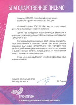 4 и 5 июня 2015 года в Новосибирске проходил III международный форум технологического развития «Технопром 2015». В рамках форума представители бизнеса и органов государственной власти, ведущие специалисты мирового и российского научного сообщества обсудили вопросы преодоления технологических ограничений экономического роста в стране и обеспечения перехода технологической базы российской промышленности на принципиально новый уклад. В работе выставочной и деловой составляющих «Технопрома 2015» приняла участие делегация НГАСУ (Сибстрин).