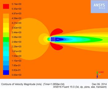 | Скорость воздушного потока в окрестности здания в разрезе | Движение воздушной среды в окрестности колонны в плане |