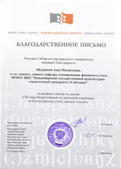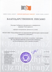 Всем участникам олимпиады были вручены удостоверения участников и памятные подарки с символикой СФУ. Председатель оргкомитета, ректор Сибирского федерального университета Е.А. Ваганов выразил особую благодарность ректору Новосибирского государственного архитектурно-строительного университета (Сибстрин) Ю.Л. Сколубовичу и всему профессорско-преподавательскому составу кафедры планирования, финансов и учета за подготовку и активное участие команды студентов во Всероссийской олимпиаде.