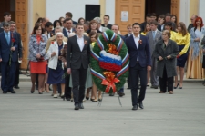 Праздник начался с торжественно-траурной церемонии, призванной отдать дань памяти непосредственным участникам тяжелейших военных лет, отдать дань памяти героям. Ректор НГАСУ (Сибстрин) Ю.Л. Сколубович, представители ректората и руководители подразделений, ветераны и труженики тыла, студенты и маленькие гости праздника – дети и внуки сотрудников с большим трепетом и почтением возложили венок и цветы к памятнику воинам-сибстриновцам, не вернувшихся с полей сражений. На нем увековечены 106 имен павших в годы войны преподавателей, работников и студентов вуза.