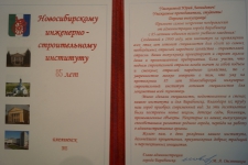 Со сцены были зачитаны поздравления, пришедшие в адрес Сибстрина: от выпускника 1971 года, первого заместителя председателя Комитета Совета Федерации по образованию и науке Виктора Семеновича Косоурова, первого заместителя министра строительства и жилищно-коммунального хозяйства РФ Леонида Оскаровича Ставицкого, заместителя губернатора Новосибирской области Сергея Николаевича Семки, Новосибирской областной общественной организации Профсоюза работников народного образования и науки РФ, главы администрации г. Барабинска Максима Анатольевича Овсянникова, настоятеля собора во имя святого благоверного князя Александра Невского протоирея Александра Новопашина.