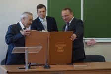 Поздравить выпускников пришел ректор НГАСУ (Сибстрин) Ю.Л. Сколубович. В ходе продолжительной и интересной беседы Юрий Леонидович затронул актуальную тему реформы высшего образования, отметив тот факт, что Сибстрин ежегодно признается эффективным в мониторинге вузов, несмотря на все сложности, рассказал про вклад попечителей и выпускников в развитие материально-технической базы университета и особо отметил высокий проходной балл приемной кампании этого года, что говорит о качестве подготовки первокурсников. Выпускники живо интересовались настоящим университета. Много вопросов было задано о современной структуре Сибстрина, общежитиях, нынешних студентах. По окончании встречи выпускники получили памятные значки с символикой вуза, а ректор рекомендовал выпускникам к просмотру фильм «Сибстрин. Портрет на фоне города», ведь кому, как не им, чья молодость пришлась на 60-е годы, будет интересно заново окунуться в историю родного вуза и Новосибирска, к которой они имеют непосредственное отношение. В свою очередь, выпускники вручили альма-матер ценный подарок – экземпляр рукописной книги «Чертежная книга Сибири» – первый русский географический атлас, составленный замечательным русским географом, картографом и топографом Семеном Ремезовым и его сыновьями в 1701 году.