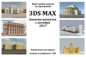 Курсы компьютерного моделирования в программе 3DS MAX Институт дополнительного образования (ИДО) совместно с кафедрой АРГС приглашает желающих на курсы компьютерного моделирования по программе 3DS MAX! Занятия проводятся 1 раз в неделю с 17 до 20 часов в течение 2-3 месяцев. Начало занятий – октябрь 2017 года. Обязательно входное тестирование для выявления уровня владения программой. Курсы рассчитаны на 64 часа и 48 часов: для начинающих и продвинутых пользователей. Стоимость обучения – 6 500 и 4 500 рублей соответственно. По окончании обучения выдается сертификат установленного образца. |