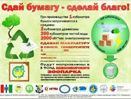 С 9 по 23 марта в вузах Новосибирска пройдет акция по сбору макулатуры, организованная Молодежным департаментом природных ресурсов и охраны окружающей среды Новосибирской области при поддержке департамента природных ресурсов и охраны окружающей среды Новосибирской области. Собранные от сдачи в переработку средства будут направлены в фонд Новосибирского зоопарка, сообщается на официальном сайте губернатора и правительства Новосибирской области.