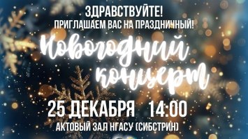 25 декабря приглашаем преподавателей, сотрудников и студентов на Новогодний концерт! Приближается самый волшебный праздник года, и мы рады пригласить вас на Новогодний концерт! Уважаемые преподаватели, сотрудники и студенты НГАСУ (Сибстрин)! Будем ждать вас 25 декабря 2024 года (среда) в 14.00 в актовом зале университета (3-й этаж главного корпуса). Всех ждут удивительные творческие сюрпризы от наших студентов! Присоединяйтесь, чтобы вместе проводить уходящий год и встретить новый с радостью и вдохновением! Не упустите возможность стать частью большого волшебного праздника! |
