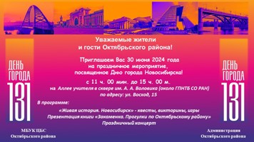 30 июня Новосибирск празднует свою 131-ю годовщину со Дня основания! 30 июня 2024 года Новосибирск празднует свою 131-ю годовщину со Дня основания! По всему Новосибирску пройдут культурно-массовые мероприятия. В Октябрьском районе для жителей и гостей города праздничные мероприятия пройдут на Аллее учителя в сквере имени А.А. Воловика возле ГПНТБ (ул. Восход, 15). Приглашаем сибстриновцев принять участие в праздновании! |