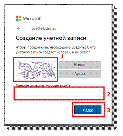 2. Для первоначальной регистрации учетной записи Microsoft, введите адрес корпоративной электронной почты (@sibstrin.ru или @edu.sibstrin.ru)(1), нажмите Создать ее (2) и затем на запрос хотите ли вы создать учетную запись, ответьте утвердительно и нажмите Далее: