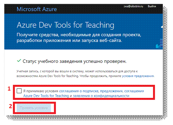 7. Для подтверждения статуса учебного заведения на вашу корпоративную почту будет отправлено письмо. Необходимо открыть входящие письма в своей корпоративной почте (@sibstrin.ru или @edu.sibstrin.ru) и найти входящее письмо от [Microsoft Academic Verification] Подтверждение академического статуса.  В нем будет ссылка для подтверждения – перейдите по ссылке в письме и откроется сайт, где нужно согласится с условиями (1) и нажать кнопку Принять условия (2):